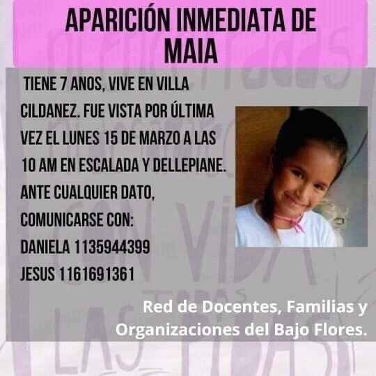 Según contó la mujer a C5N, ayer unos vecinos vieron a un cartonero sacar la bicicleta de la menor de un contenedor de basura en Dellepiane y Miralla, tras lo cual dos tíos de Maia se la llevaron al interior del barrio Cildañez, donde continuaban las investigaciones para dar con su paradero.