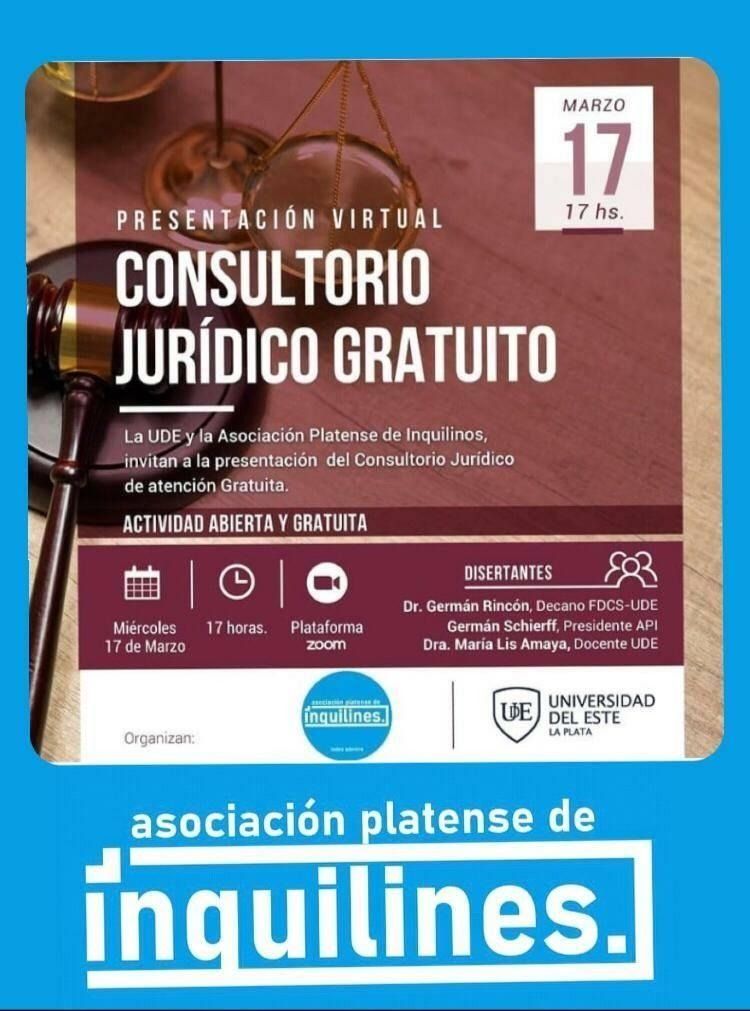 La Facultad de Derecho y Ciencias Sociales realizará la presentación del Consultorio Jurídico Gratuito de la Universidad del Este (UDE) junto a la Asociación Platense de Inquilinos en el marco del convenio suscripto el 11 de marzo del año pasado.
