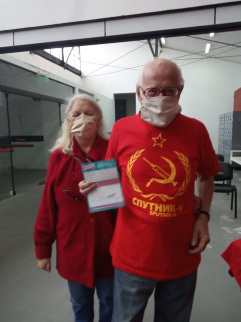 Se trata de un hombre de 85 años, quien llegó al Hospital San Martín a vacunarse, usando una remera “pro vacuna” que llamó la atención de muchos. La misma tiene el dibujo del símbolo de la Unión Soviética, modificado con una jeringa que hace referencia al antídoto contra la pandemia.