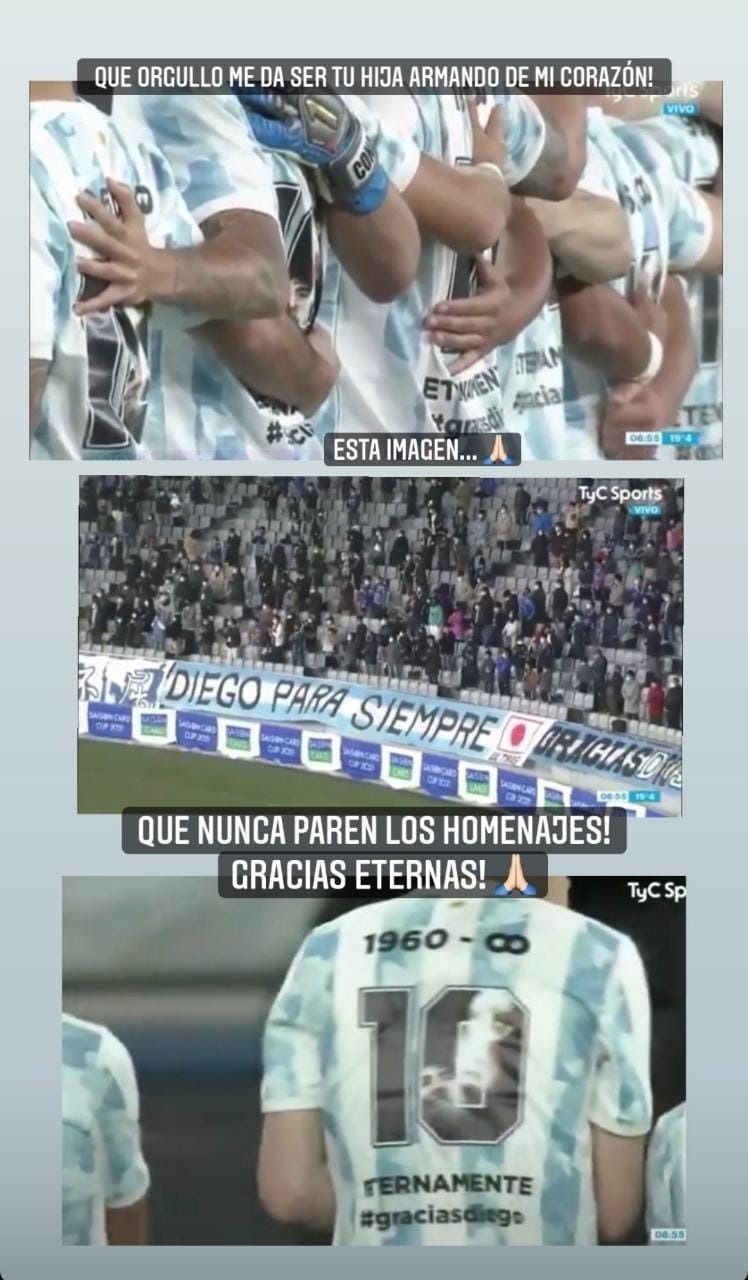 Gianinna, la hija menor de Diego con Claudia Villafañe, se emocionó ante el gesto. “¡Qué orgullo me da ser tu hija Armando de mi corazón!”, escribió. Y cerró: “”Que nunca paren los homenajes. Gracias eternas”.