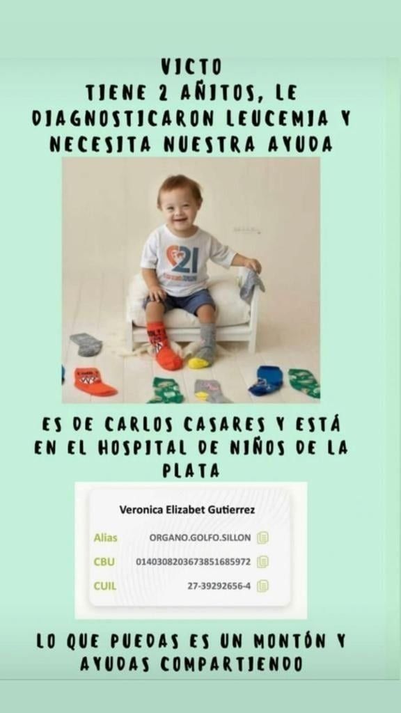 En La Plata se inició una campaña solidaria para ayudar a Victorino Aragonés, un bebé con síndrome de Down oriundo de Carlos Casares que se encuentra internado en nuestra ciudad. El nene de 2 años fue diagnosticado con leucemia y su familia precisa colaboración para poder acompañarlo mientras dure el tratamiento.