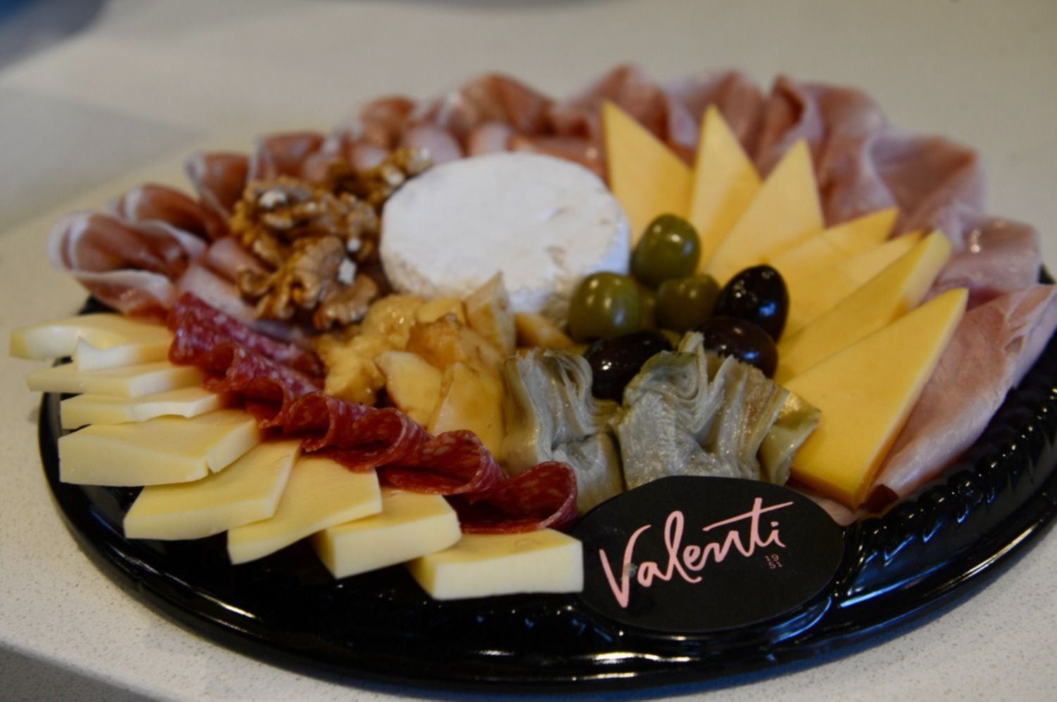 Un mini Camembert toma el centro de la escena. Lo rodean nueces, aceitunas verdes y negras. También fetas de jamón crudo y cocido, milimétricamente acomodadas, junto a otras de salame. La corona se completa con pequeños cuadrados, rectángulos y triángulos de distintas variedades de quesos. Una postal irresistible, que invita a degustarla de inmediato. Esa es una de las tantas propuestas de Valenti, la reconocida marca de fiambres premium que arribó por primera vez a La Plata de la mano de Baxar Mercado.