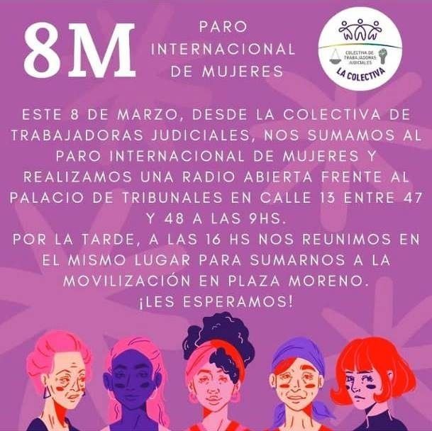 Bouchoux expuso que en el marco del 8M la Colectiva realizará este lunes una radio abierta durante todo el día frente al Palacio de Tribunales de la provincia, en 13 entre 47 y 48, para visibilizar el informe y dar a conocer los requerimientos de las trabajadoras a la Corte provincial. "Reclamamos la creación de una Secretaria de Género tanto en el ámbito de la Suprema Corte y la Procuración, órgano que consideramos estratégico para materializar las tan impostergables transformaciones que requiere el Poder Judicial", dijo y agregó: "Como trabajadoras judiciales, tenemos la firme convicción de que resulta indispensable la realización de profundos cambios para erradicar las desigualdades y los hábitos misóginos dentro de nuestro ámbito laboral, como también, construir prácticas colectivas que conviertan al Poder Judicial en una institución clave para lograr una transformación social con perspectiva de género y enfoque de derechos", indicó.