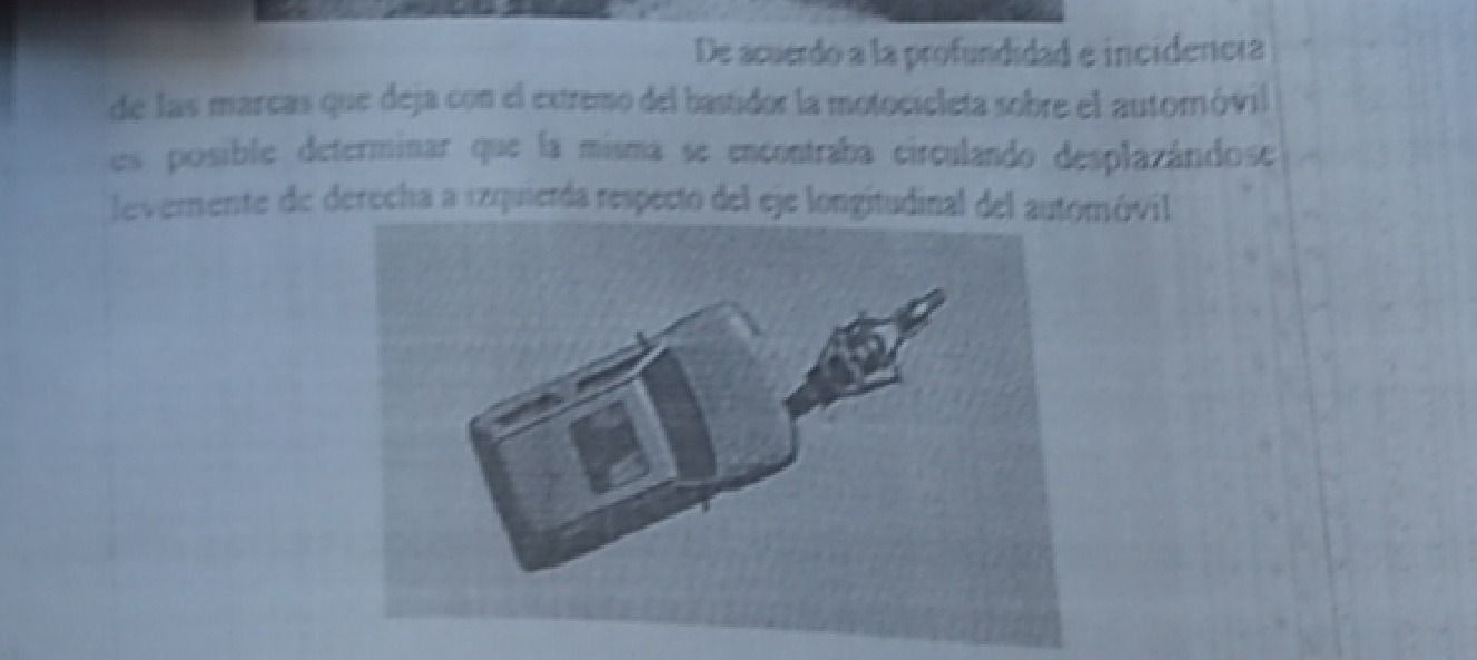 Una de las imágenes de la reconstrucción del accidente da cuenta que el auto embistió a la moto desde atrás. El golpe fue de lleno con el centro de la parte delantera del automóvil. Pero la defensa hace una lectura diferente.