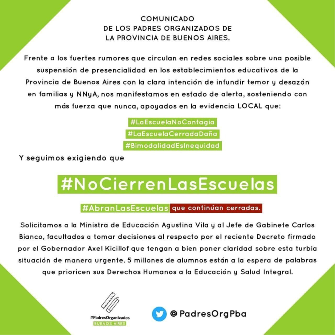 “Frente a los rumores que circulan en redes sociales sobre una posible suspensión de presencialidad en los establecimientos educativos de la Provincia de Buenos Aires con la clara intención de infundir temor y desazón en familias y NNyA, nos manifestamos en alerta, sosteniendo con más fuerza que nunca, apoyados en la evidencia local que: #LaEscuelaNoContagia, #LaEscuelaCerradaDaña, #BimodalidadEsInequidad”, fue el comunicado que difundió en sus redes sociales la cuenta @PadresOrgPba.