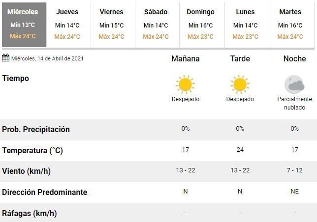 El jueves en tanto continuarán las buenas condiciones de tiempo, con un leve ascenso de temperaturas. Mientras que el para el viernes pronostican una jornada despejada y con buen tiempo (también habrá una máxima de 24°C) y vientos leves del sector este.