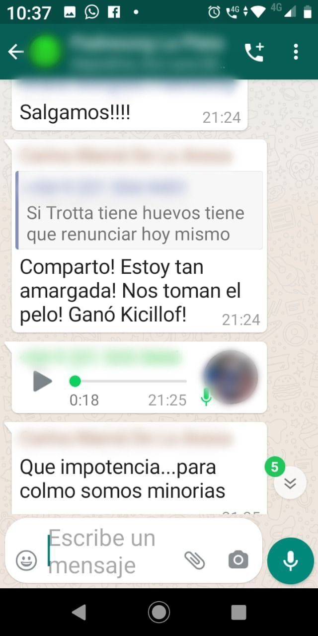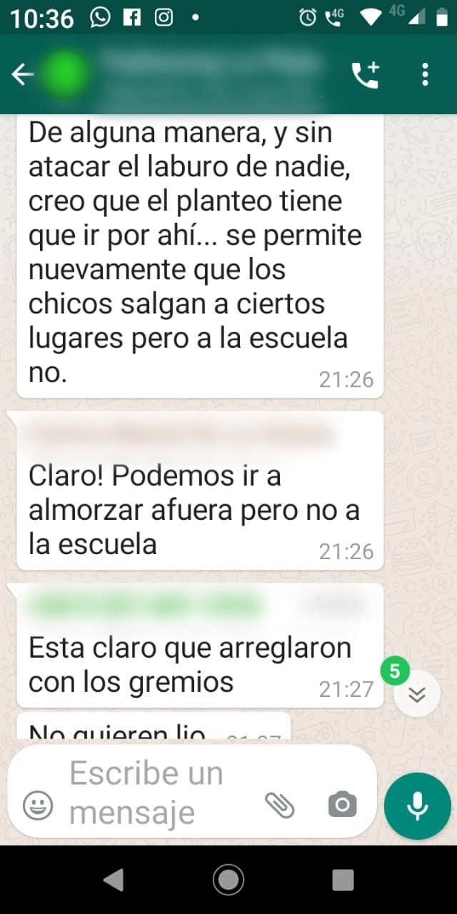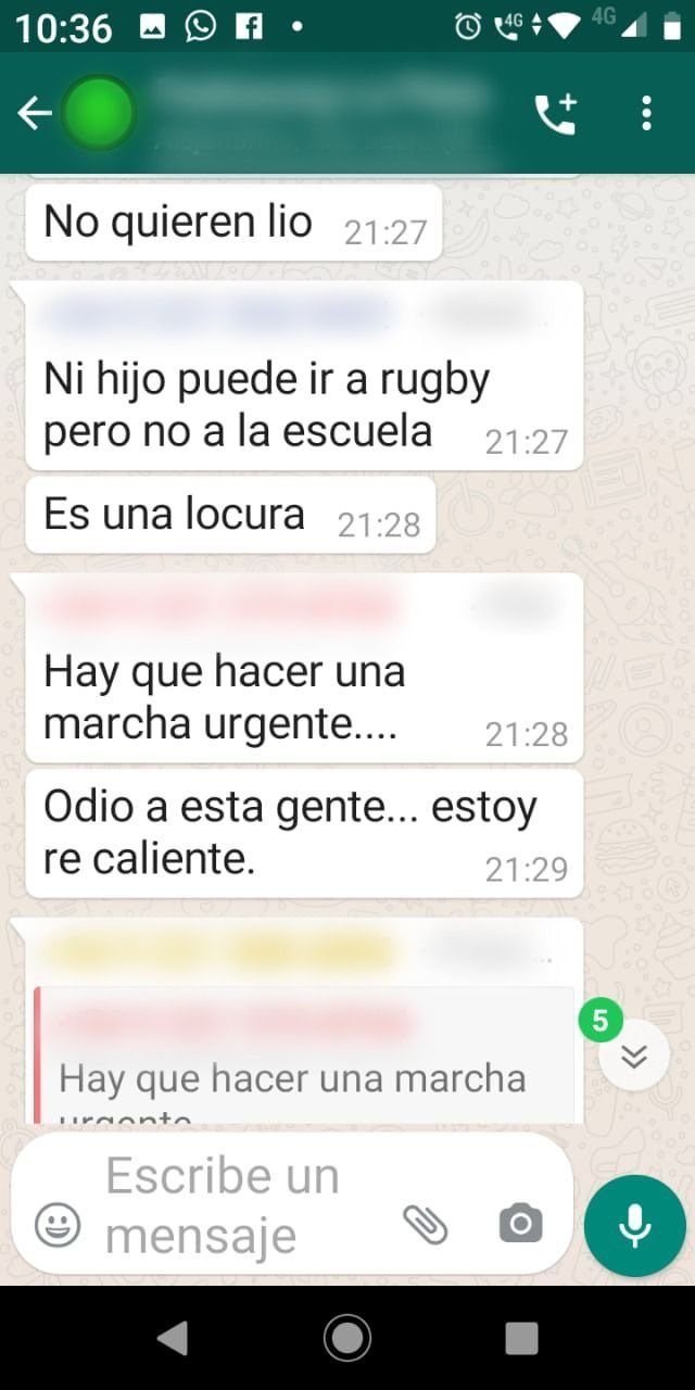 En el grupo de WhatsApp de la sala de jardín de su hija no hubo más que opiniones en contra de la medida, aunque otras madres consultadas por 0221.com.ar coincidieron en sostener que los padres que están a favor de la virtualidad "se llaman a silencio" en los grupos que arden de la indignación.