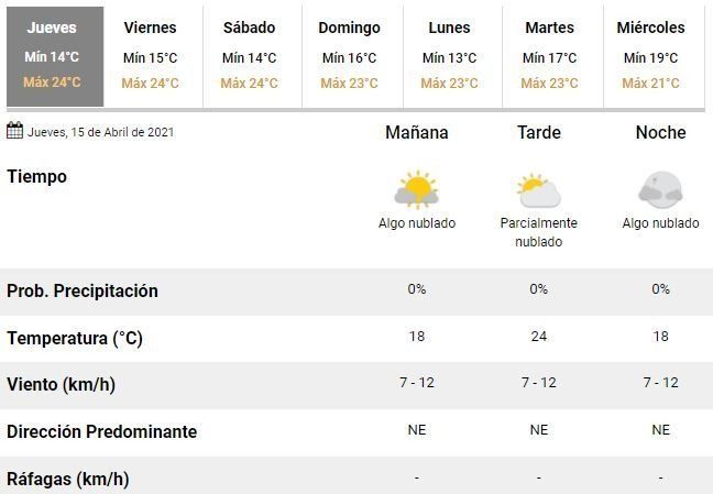"Los próximos días serán buenas con poco cambio en las temperaturas", agregaron y remarcaron que para este jueves se espera una mínima de 13°C y una máxima de 25°C, mientras que el jueves variará entre 14 y 25°C y el sábado de 15 a 25°C.