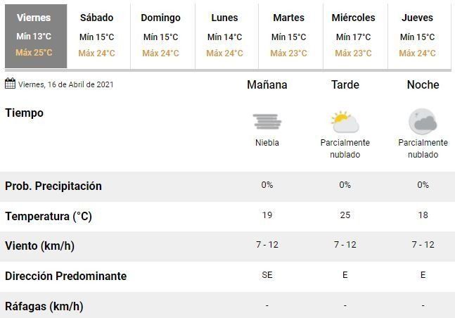 El viernes comenzó algo fresco, con una mínima en torno a los 13°C; pero se espera un buen tiempo para lo que resta de la semana y por eso la temperatura irá en aumento hasta llegar, según los expertos, a unos 25°C. El buen clima se mantendrá además durante el fin de semana.
