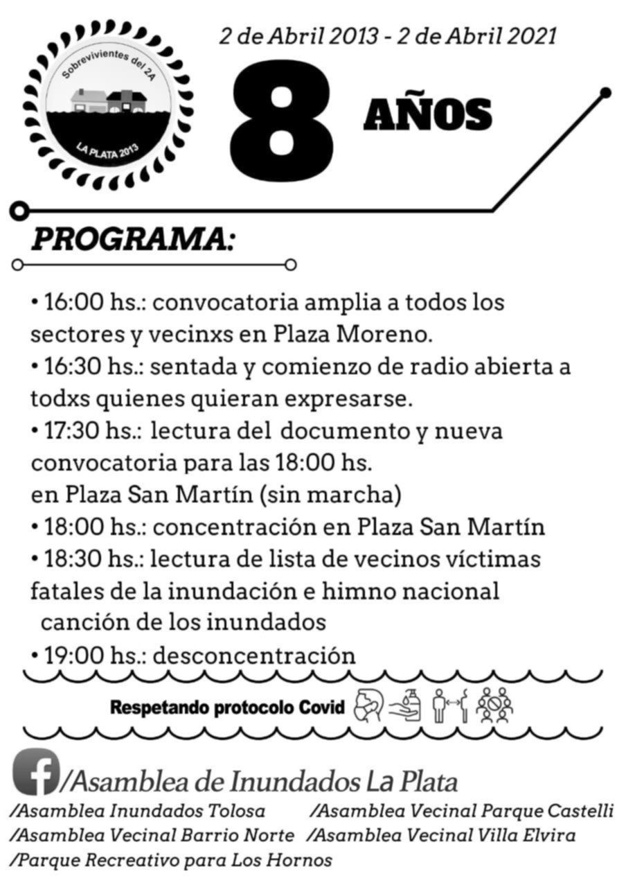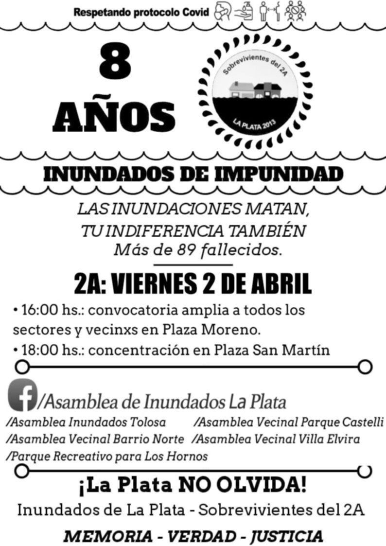 A ocho años y con un estricto protocolo por el COVID-19, las organizaciones de vecinos detrás de la propuesta convocaron a los platenses a movilizarse a las 18 de este viernes hasta las puertas del Palacio Municipal en Plaza Moreno y una hora después a concentrarse frente a la Gobernación bonaerense, en Plaza San Martín. Se exigirá justicia por todas las víctimas fatales y también se reclamará por obras y un plan integral para evitar que algo similar pueda volver a ocurrir en nuestra ciudad.
