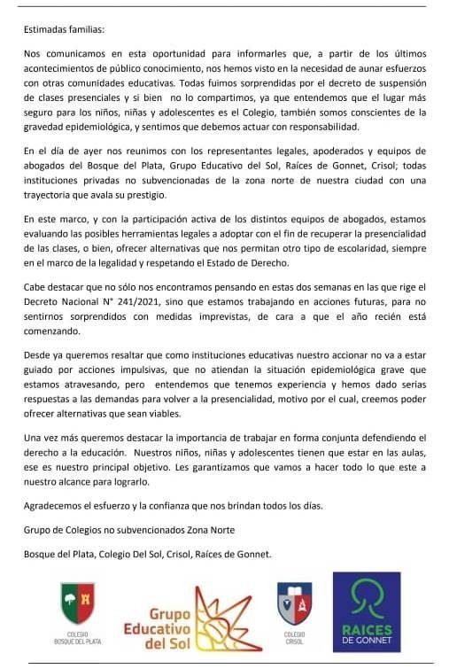 "Nos comunicamos en esta oportunidad para informarles que a partir de los últimos acontecimientos de público conocimiento, nos hemos visto en la necesidad de aunar esfuerzos con otras comunidades educativas. Todos fuimos sorprendidos por el decreto de suspensión de clases presenciales y si bien no lo compartimos, ya que entendemos que el lugar más seguro para los niños, niñas y adolescentes es el colegio, también somos conscientes de la gravedad epidemiológica y sentimos que debemos actuar con responsabilidad", indicaron en el escrito que ya fue enviado a los padres.