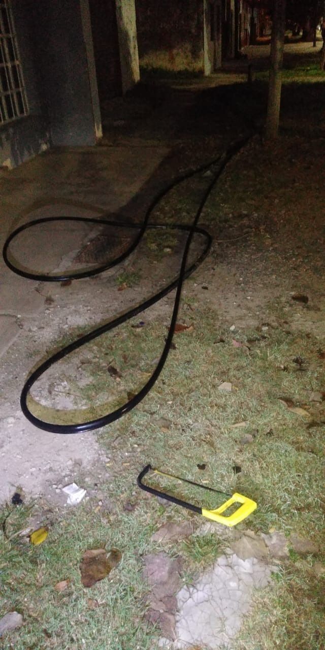 De esta manera, los agentes revisaron la zona y a las pocas cuadras encontraron a los sospechosos en medio del acto: uno hacía de campaña mientras el otro, todavía arriba del árbol, cortaba los cables con un machete.