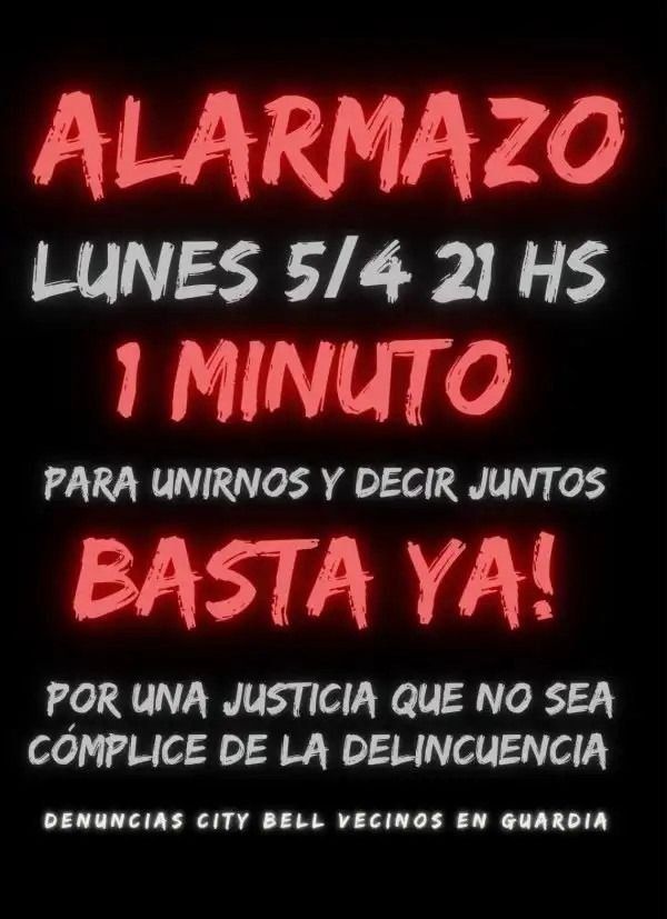 La ruidosa protesta está prevista para este lunes a las 21, momento en el que comenzarán a sonar las sirenas de las alarmas particulares con el objetivo que "las autoridades responsables escuchen y sepan la gravedad de la situación que padecemos los ciudadanos comunes en relación a la inseguridad", detallaron los organizadores a 0221.com.ar.