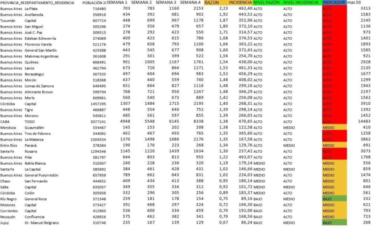 Vale remarcar que los indicadores que se utilizan para decir que un departamento tiene "alto riesgo" son la incidencia de casos en los últimos 14 días, el número de casos cada 100 mil habitantes y la razón de casos, es decir los casos de las últimas dos semanas comparado con los casos en las dos semanas anteriores.