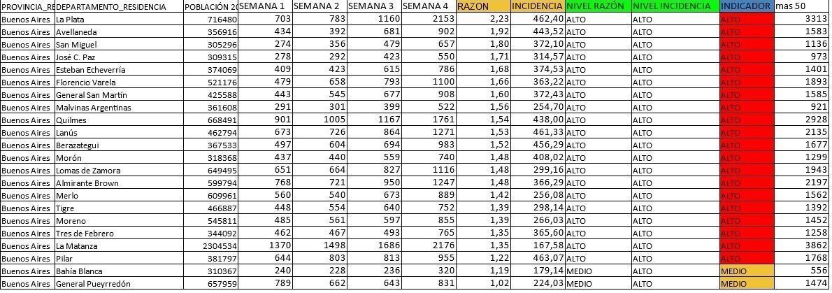 De esta forma, La Plata se pone en lo más alto de la tabla que abarca a las ciudades con más de 300 habitantes de todo el país. Detrás se ubica Avellaneda y en tercer lugar Tucumán Capital. Cabe destacar que de los primeros 20 puestos del ránking, sólo hay cuatro ciudades que no pertenecen a la provincia de Buenos Aires, lo que indica la dura situación epidemiológica que atraviesa la misma.