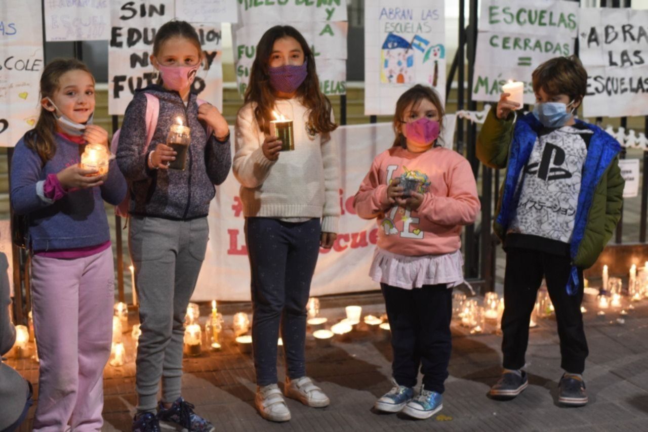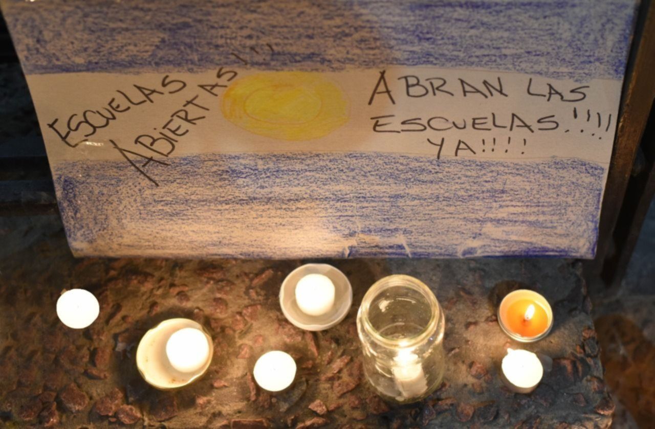 Padres, madres, abuelos y niños pasaron por el lugar. Algunos dejaros la vela encendida y otros participaron durante toda la actividad. Allí afirmaron que los derechos de los niños "están siendo vulnerados" y que “las escuelas no son lugares de coronavirus".