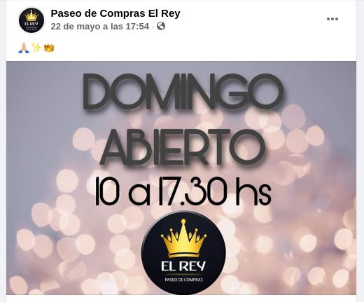 Sin embargo, lo más llamativo es que las redes sociales del Paseo de Compras El Rey anunció que el complejo iba a estar a abierto este domingo de 10 a 17.30, a pesar de que el último DNU del Gobierno nacional especifica que este tipo de actividades está restringida.