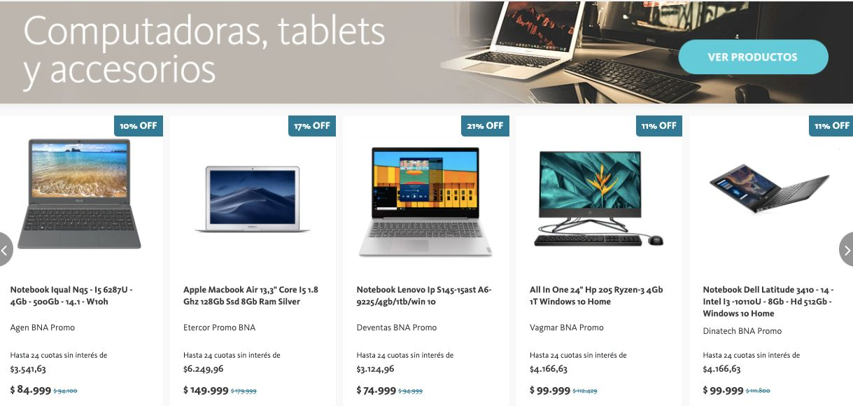 Bajo el lema "Tienda BNA te conecta", desde el 26 de mayo y hasta el 28, inclusive, se podrá acceder a descuentos de hasta el 20% en la compra de computadoras portátiles de marcas como Apple, Lenovo y Dell. La entidad informó que la promoción ofrece hasta 24 cuotas sin interés en la financiación de equipos portátiles con cuotas que van desde los $2.000 pesos.