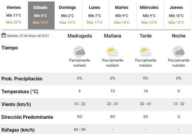 Los especialistas también indicaron que durante el fin de semana la temperatura registrará un abrupto descenso, con mínimas de 6 y 2°C durante los próximos sábado y domingo, respectivamente. En esa línea adelantaron que en el primero de los dos días de descanso el viento soplará del sur y sudoeste con gran fuerza y durante las primeras horas podrían registrarse fuertes ráfagas de hasta 50 km/h.