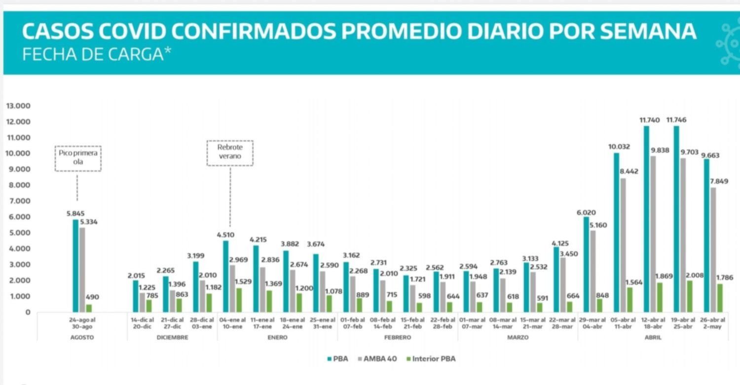 A la siguiente, que corresponde al período entre el 19 y 25 de abril, en pleno auge de las medidas restrictivas, la curva marcó un leve descenso en el AMBA , donde cerró en 9.703 -casi 150 casos menos que la semana anterior- mientras que en la provincia las estadísticas marcaron una meseta respecto a la semana previa, con 11.746.