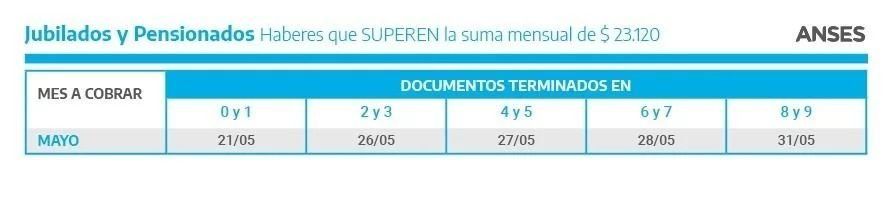 Cobrarán en dos tandas. En la primera, estarán los que perciben menos de $21.393, cuyos beneficiarios cobrarán desde el lunes 10 hasta el jueves 20 de mayo. A partir del lunes 21, lo hará el resto.