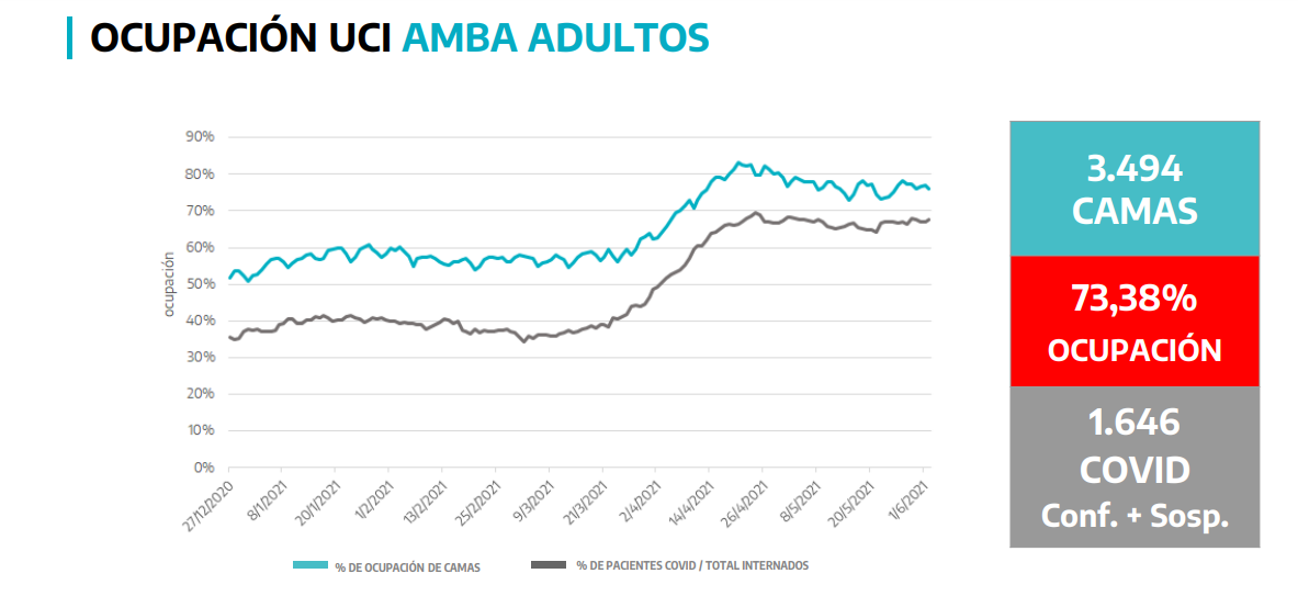 Son cifras algo más altas que la informadas por el ministro de Salud bonaerense, Daniel Gollan, en la conferencia de prensa de un día antes, cuando indicó que de 3.494 plazas del AMBA estaban ocupadas el 73,38% y que 1.646 pacientes eran infectados con coronavirus o sospechosos de estarlo.