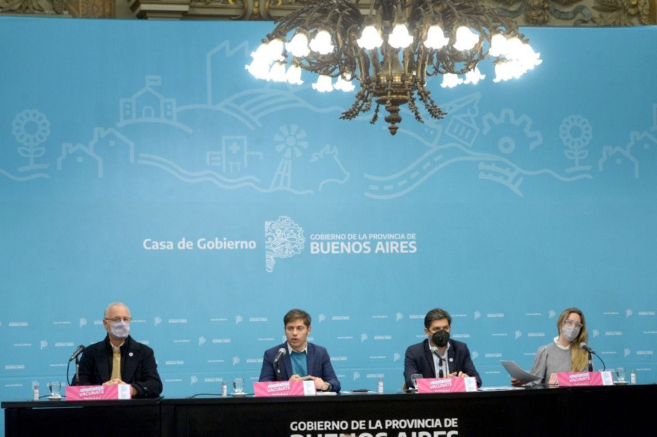 Kicillof cerró la batería de anuncios avanzando sobre la próxima etapa de vacunación, cuyo objetivo es el de trabajar sobre el tercer hito desde este mismo jueves, que incluye a toda la población objetivo priorizada, que "son todos los mayores de 60 años, todos los mayores de 18 con riesgos preexistentes, además de los priorizados (trabajadores de salud, educación y seguridad)".