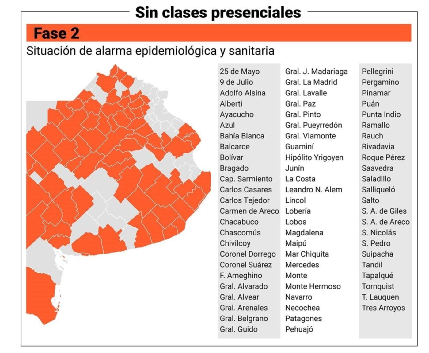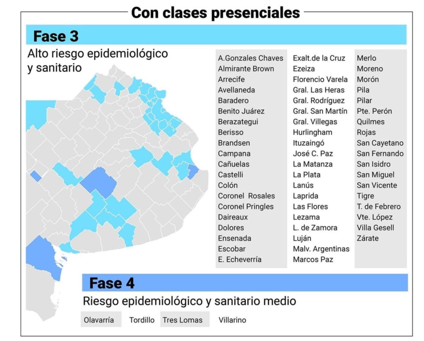 Alrededor de tres millones de alumnos del conurbano bonaerense podrán retomar sus estudios de manera presencial, pero más de la mitad de las jurisdicciones provinciales continuarán con las escuelas cerradas. Muchos distritos del interior de la provincia como Mar del Plata, Bahía Blanca y Necochea, entre otros; todavía mantienen la alarma epidemiológica y la debida restricción escolar, 72 partidos en un total de 135 no estarán dentro de las disposiciones de la vuelta escalonada a clases.