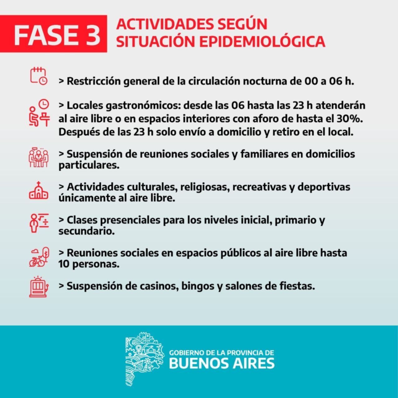 Con el pase de Fase 2 a Fase 3, en la provincia de Buenos Aires los bares y restaurantes ya pueden atender a sus clientes de 6 a 23 al aire libre y en el interior de sus locales con un aforo de hasta el 30%. Más allá de ese horario y hasta la medianoche, en tanto, solo podrán realizar envíos a domicilio o entregar comida para llevar.
