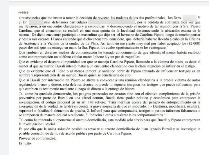 En este sentido, Vargas expresó que "en virtud de los hechos denunciados por el menor I.C. en la causa de Juan Ignacio Buzali, el marido de Piparo, he solicitado la revocación de su arresto domiciliario".