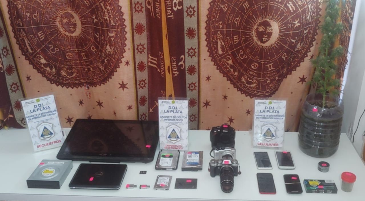 En el lugar, las autoridades secuestraron cuatro celulares, tres discos rígidos, cinco pendrives, tres cámaras de foto, una balanza de precisión, una planta de marihuana y un frasco con cogollos, arrojando un pesaje de 10,5 gramos. Todos los elementos junto al imputado quedaron a disposición de la UFI Nº 15 por el delito de "grooming e infracción a la Ley 23.737".