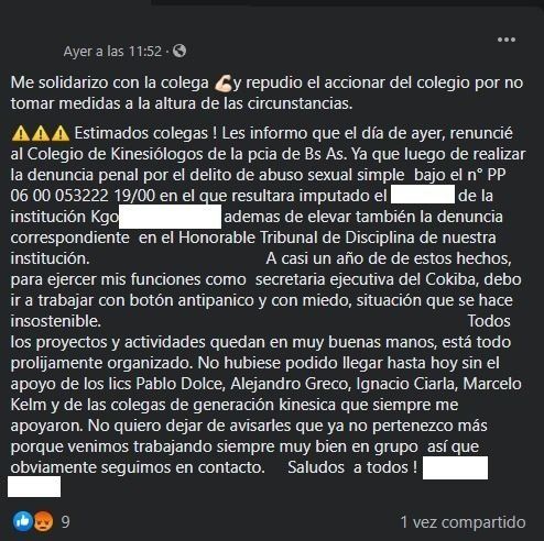 El tema explotó públicamente un año después cuando la mujer difundió en las redes sociales la decisión de renunciar a su cargo. "A casi un año de de estos hechos, para ejercer mis funciones como secretaria ejecutiva del Cokiba, debo ir a trabajar con botón antipánico y con miedo, situación que se hace insostenible", dice en esa publicación donde acusa al kinesiólogo G.V.