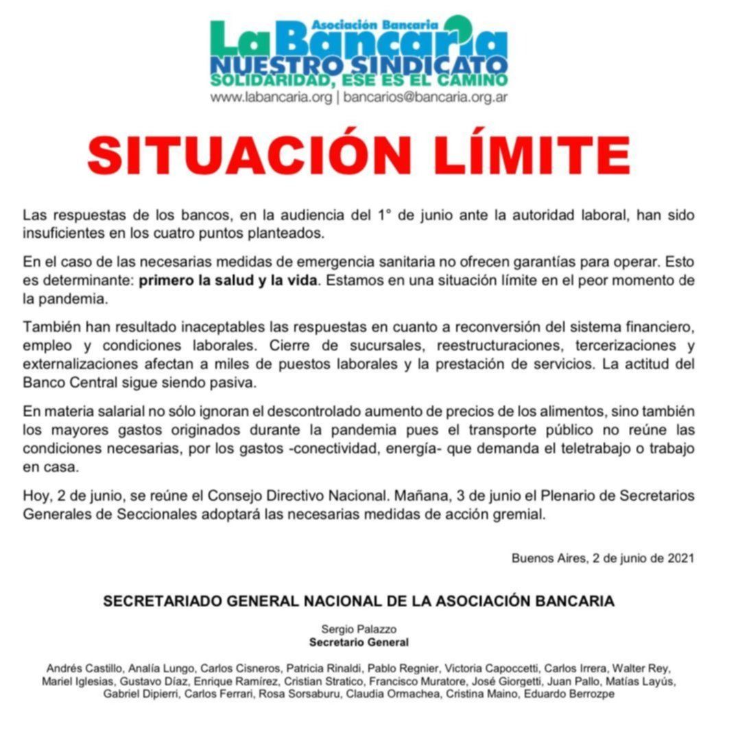 El secretario general de La Bancaria, Sergio Palazzo, adelantó que analizan un paro si el sector empresario no responde a sus pedidos por la pérdida de empleos, aplicación de medidas sanitarias y una readecuación de la paritaria. A través de un comunicado, desde el gremio manifestaron que “es una situación límite en el peor momento de la pandemia”.