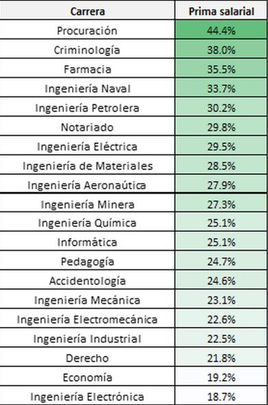 Esa cifra fue considerada la “prima salarial” y a partir de ahí se elaboró un ranking con las carreras que mejor pagan y las que peor lo hacen. En el primer grupo están la procuración (con salarios un 44,4% por encima de esa prima), la criminología (38%), la farmacia (35,5%), la ingeniería naval (33,7%) y la ingeniería petrolera (30,2%).