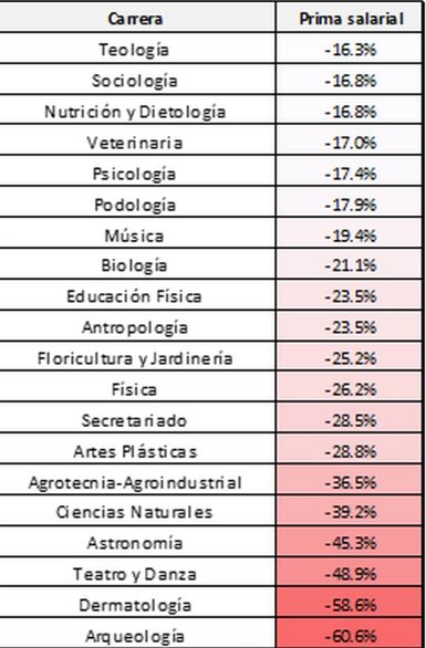 En la otra punta se encuentran la arqueología (sus graduados ganan un 60,6% menos que esa prima salarial), la dermatología (-58,6%), teatro y danza (-48,9%), astronomía (-45,3%) y ciencias naturales (-39,2%).