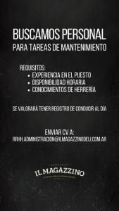 La reconocida cadena de picadas gourmet platense, Il Magazzino, que posee numerosas sedes en La Plata y City Bell, abrió una nueva oferta laboral y busca personal para realizar tareas de mantenimiento en uno de sus depósitos de mercadería.
