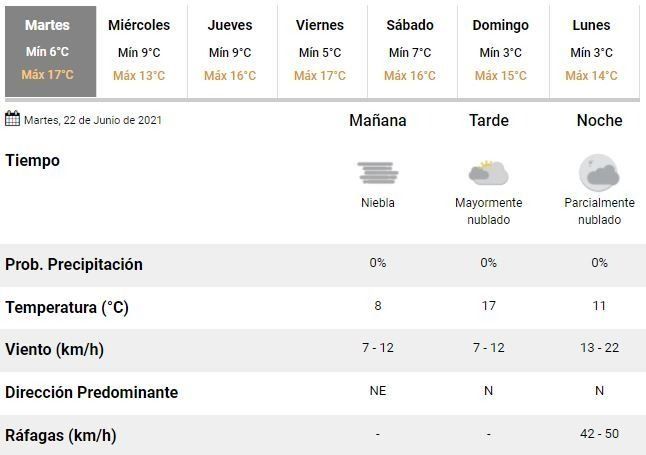 De acuerdo con los expertos, este martes transcurrirá con abundante nubosidad y una temperatura que irá de 6 a 17°C y, si bien las condiciones del tiempo no serán malas, se espera que hacia la noche se registren fuertes vientos con ráfagas de hasta 50 km/h.