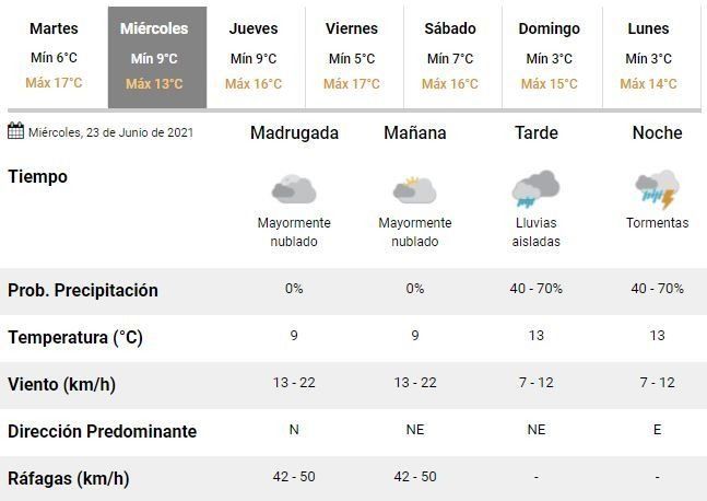 Lo peor llegaría el miércoles. Los especialistas prevén para entonces una jornada con mucha nubosidad y, finalmente, lluvias y tormentas desde la tarde y hasta la noche y la madrugada del jueves.