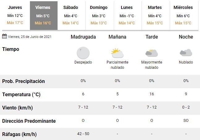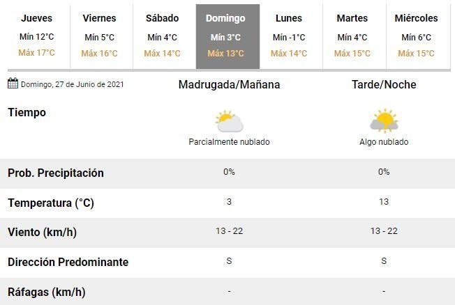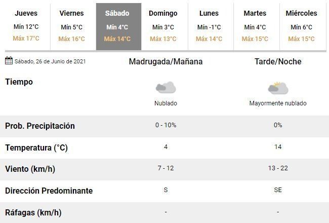 La temperatura seguirá bajando a lo largo del fin de semana, para cuando se aguardan mínimas de 4°C, el sábado; y 3°C, el domingo; y con vientos leves soplando desde el sur.