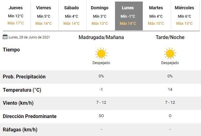 Aunque para el lunes se espera una jornada a puro sol, ese día se registraría el frío más extremo, con una mínima prevista de -1°C en la ciudad. Los expertos anticipan una jornada con un clima agradable pero bajísimas temperaturas, que comenzarán a aumentar levemente a partir del martes.