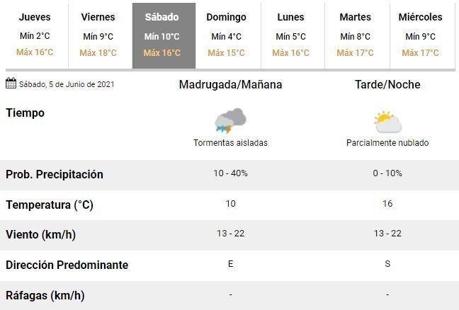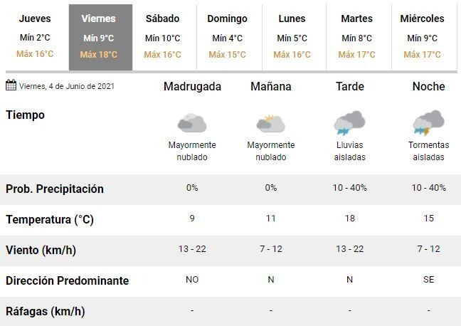 Pese a que para los próximos días se espera un ascenso de la temperatura, con mínimas de 9 y 10°C el viernes y el sábado, respectivamente; también se prevén algunas tormentas aisladas para la noche del último día de la semana y el comienzo del primero de los dos días de descanso.