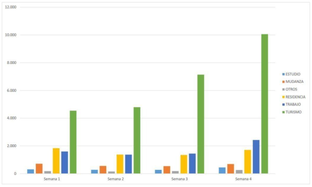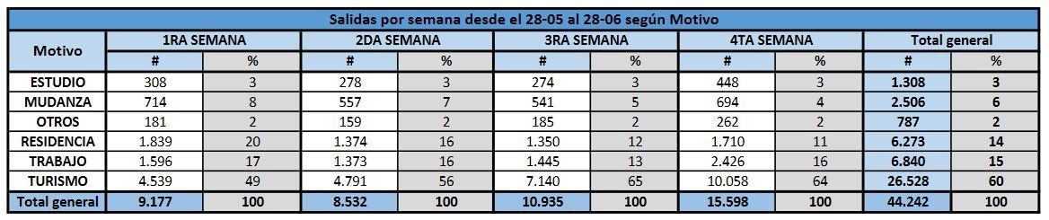 De acuerdo con la entidad, más de 44 mil personas salieron del país entre el 28 de mayo y el 28 de junio y el 60% lo hizo por turismo. El 14% lo hizo por motivos de residencia y el 15% por trabajo. El porcentaje restante se divide entre "mudanza" y “estudio". Migraciones también detalló que unos 26 mil argentinos salieron del país en el último mes con fines turísticos y, de ellos, 10 mil viajaron en la última semana.