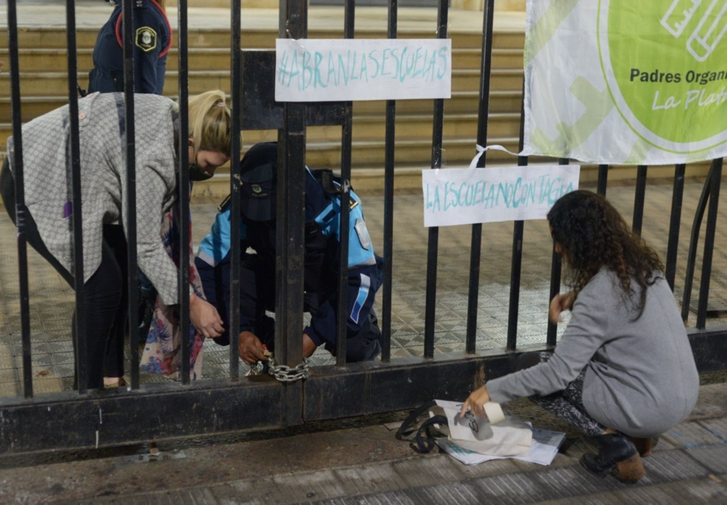 El grupo de Padres Organizados La Plata realizó una nueva vigilia por la educación este viernes en Casa de Gobierno, para pedir por la vuelta a clases presenciales. Fue esta tarde, sobre las rejas de 6 entre 51 y 53.