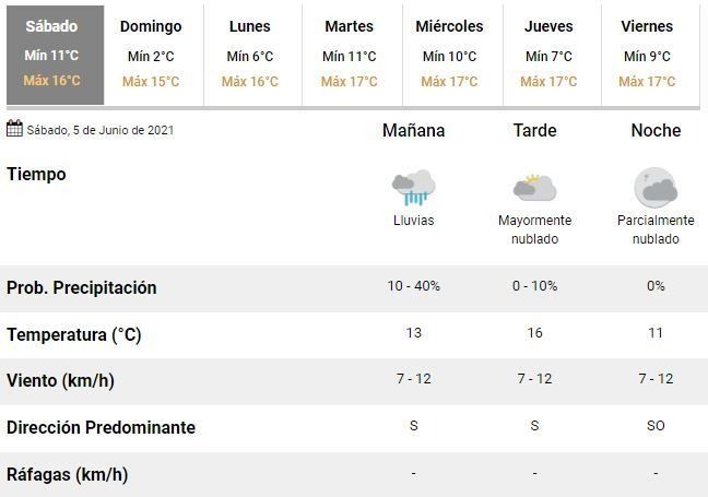 El sábado comenzó con una mínima de unos 11°C y los expertos del Servicio Meteorológico Nacional (SMN) esperan una máxima en torno a los 16°C. La jornada, según anticipan, seguirá con mal clima, mayormente nublada y vientos muy leves soplando desde el sur y sudoeste.