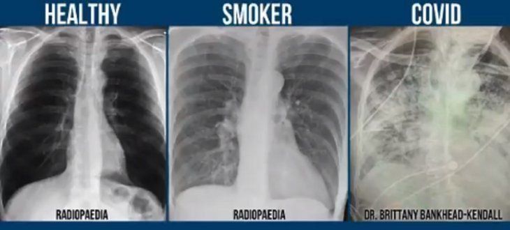 Así es como la médica y profesora asistente de la Universidad Técnica de Texas, Estados Unidos, Brittany Bankhead-Kendall, comparó las radiografías de los pulmones de pacientes que no enfermaron de coronavirus, quienes sí lo hicieron y de fumadores, advirtiendo que el resultado "es alarmante".