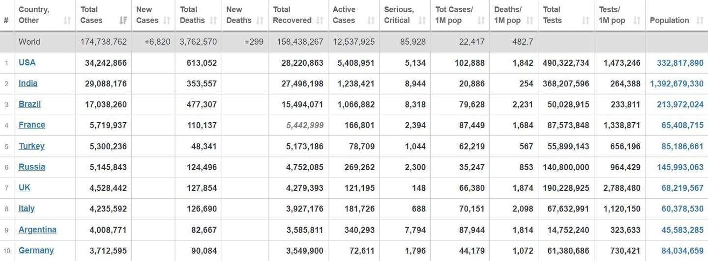 Sin embargo, la llegada de la segunda ola cambió el panorama. A fines de mayo, nuestro país volvió a trepar a la décima colocación. Y ahora ascendió otro lugar en el ranking liderado por Estados Unidos (34.242.866), seguido de India (29.088.176) y Brasil (17.038.260). Tal como reflejan los números, cuarto se ubica Francia (5.719.937), y tras ellos Turquía (5.300.236), Rusia (5.145.843), Reino Unido (4.528.442) e Italia (4.235.592). Por último aparece Argentina (4.008.771) y en el décimo lugar se sitúa Alemania (3.712.595).
