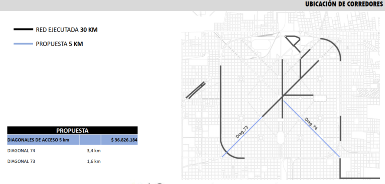 Para el proyecto de ciclovías, la intervención total consiste completarán y conectar los los corredores existentes, promoviendo la incorporación de nuevos circuitos con la colocación de cordones pre moldeados para la identificación clara de la separación física que protege la circulación de los ciclistas que utilicen esa vías.