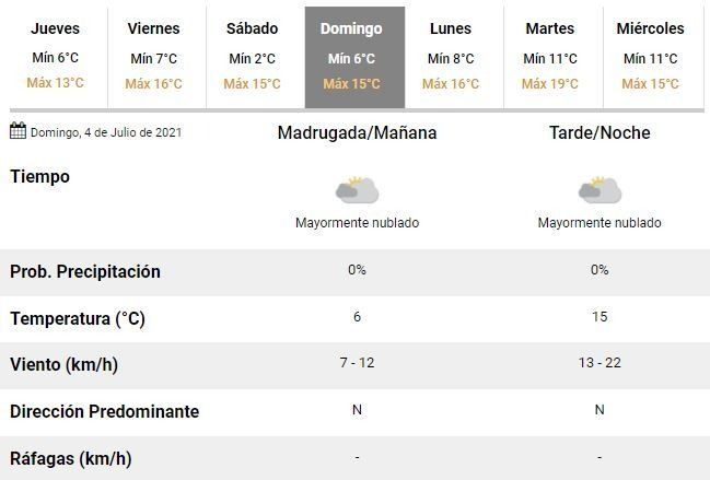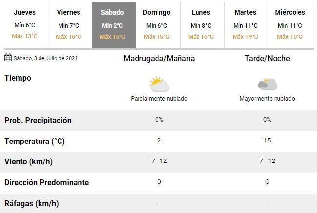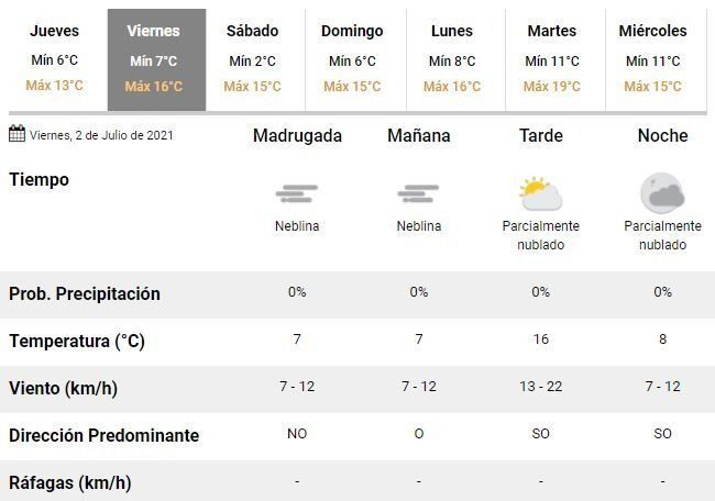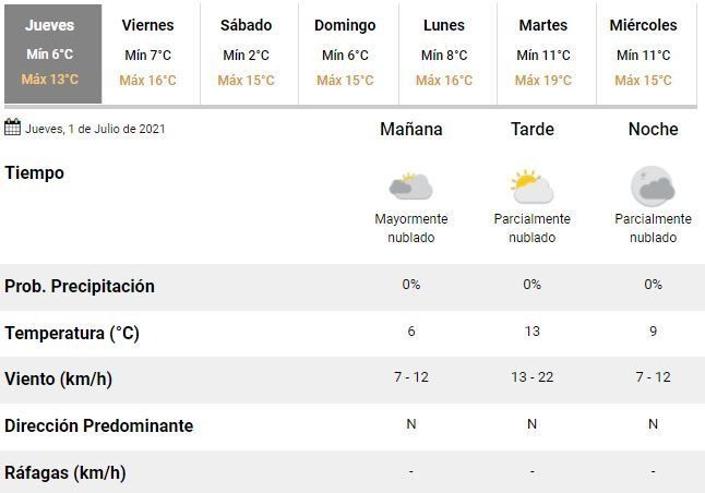 Para el viernes, en tanto, se espera un leve ascenso de la temperatura, que oscilaría entre 7 y 16°C, en la previa de un nuevo fin de semana helado en la ciudad, con mínimas de 2 y 6°C y máximas entorno a los 15°C para los próximos sábado y domingo, respectivamente.
