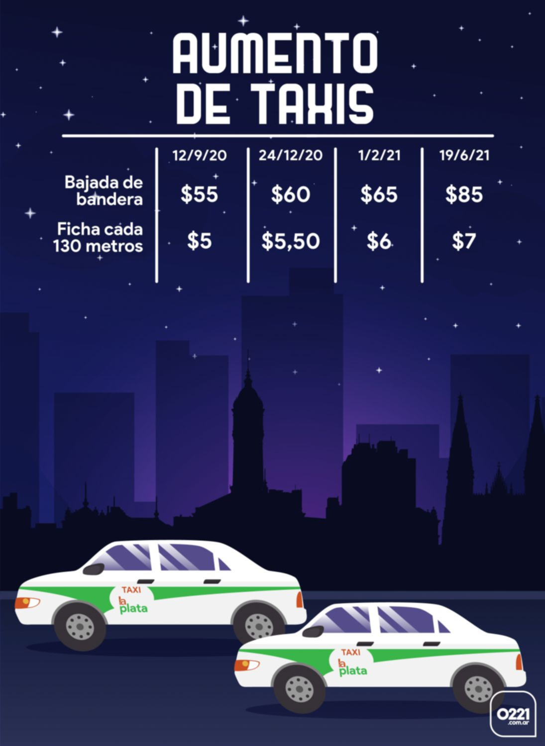 La última suba había sido el 1º de febrero pasado cuando la tarifa pasó de 60 a 65 pesos para la bajada de bandera, y de 5,5 a 6 pesos la ficha que cae cada 130 metros de recorrido.