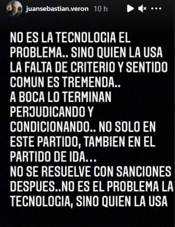 “No es la tecnología el problema, sino quién la usa. La falta de criterio y sentido común es tremenda. A Boca lo terminan perjudicando y condicionando no solo en este partido, también en el partido de ida", fue el mensaje que publicó Juan Sebastián Verón en sus redes sociales, tras el escándalo del partido por Copa Libertadores entre Atlético Mineiro y el conjunto Xeneize.